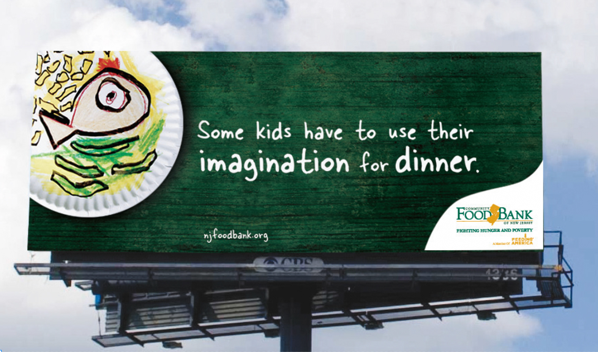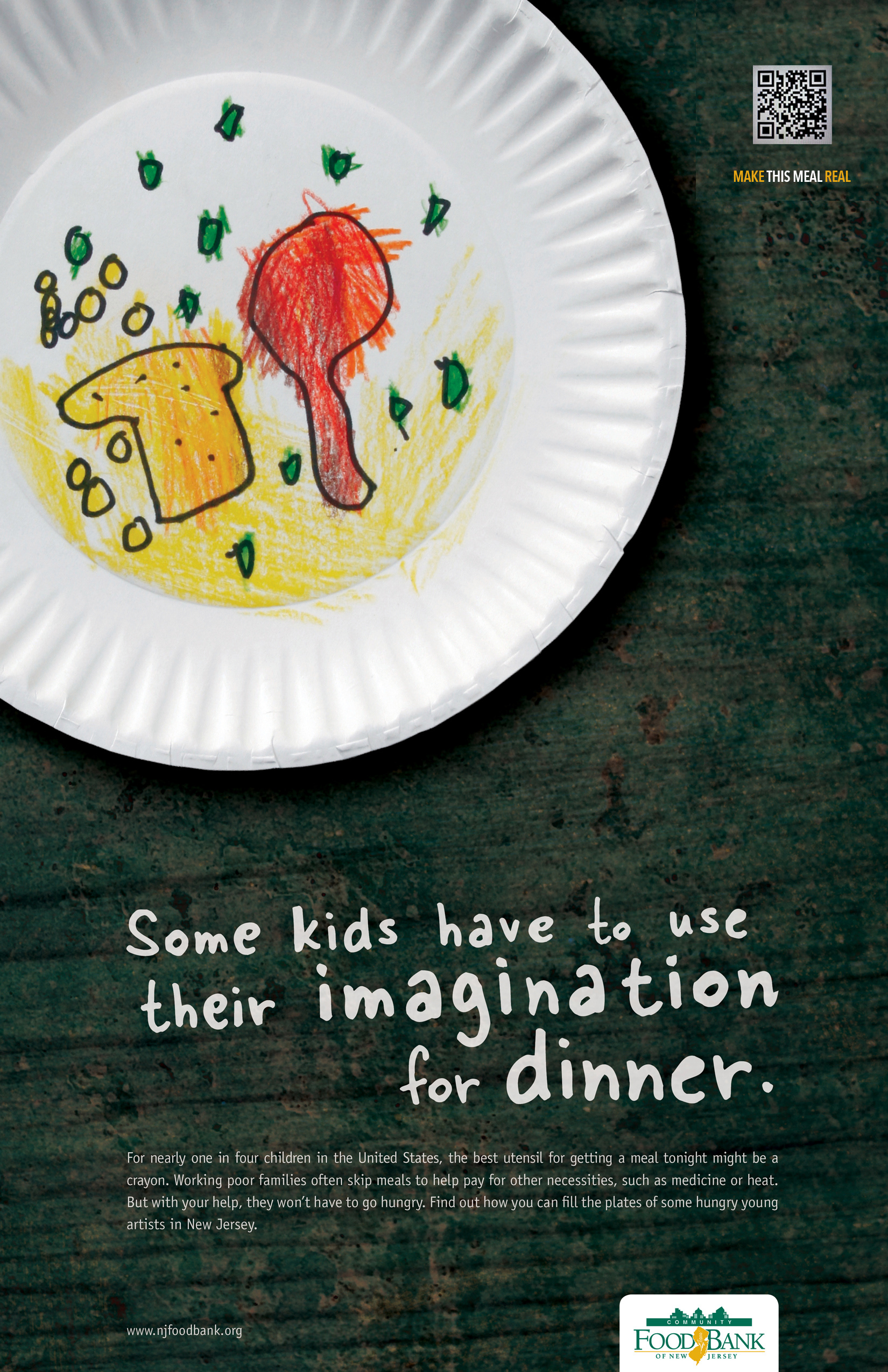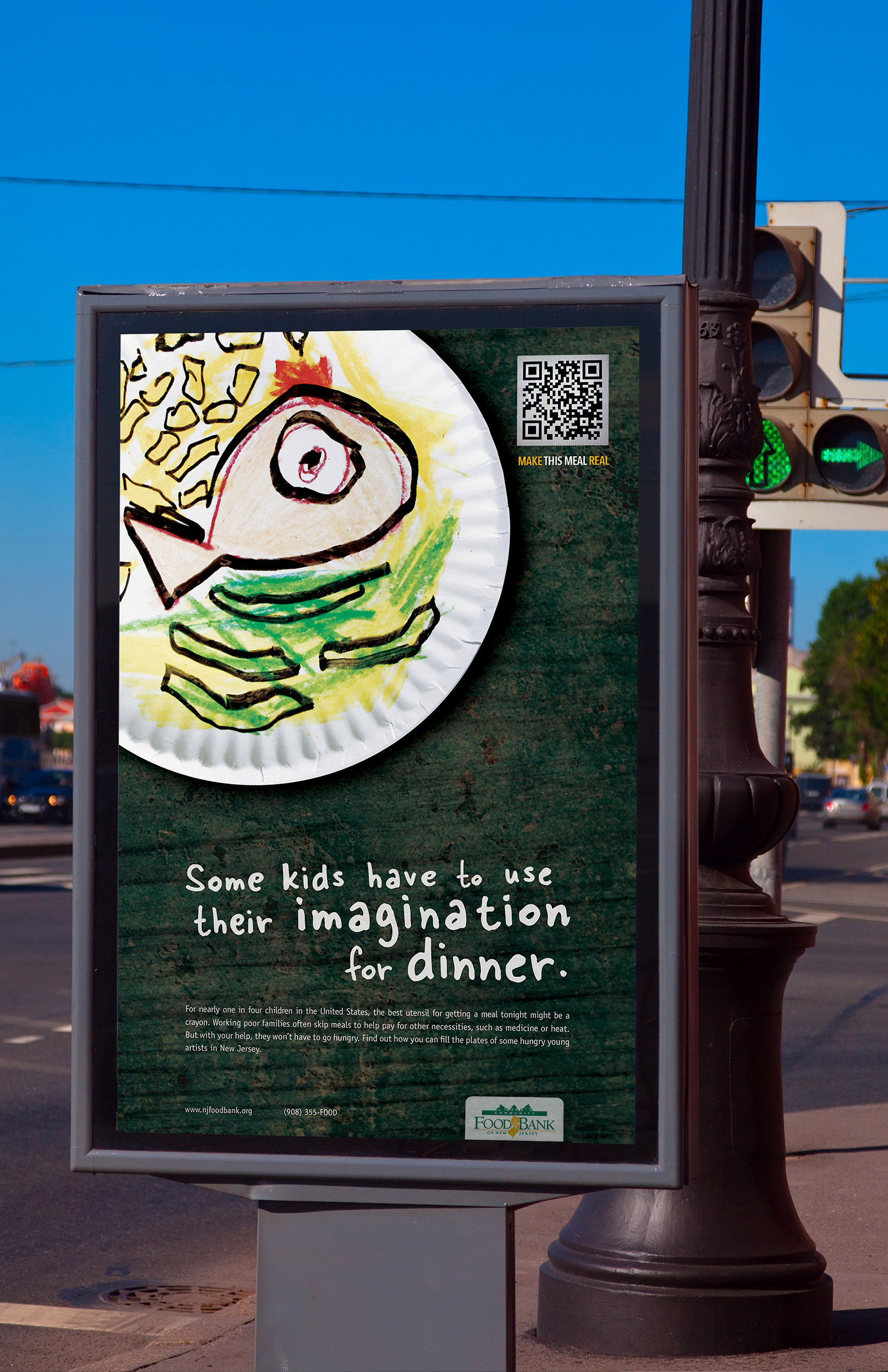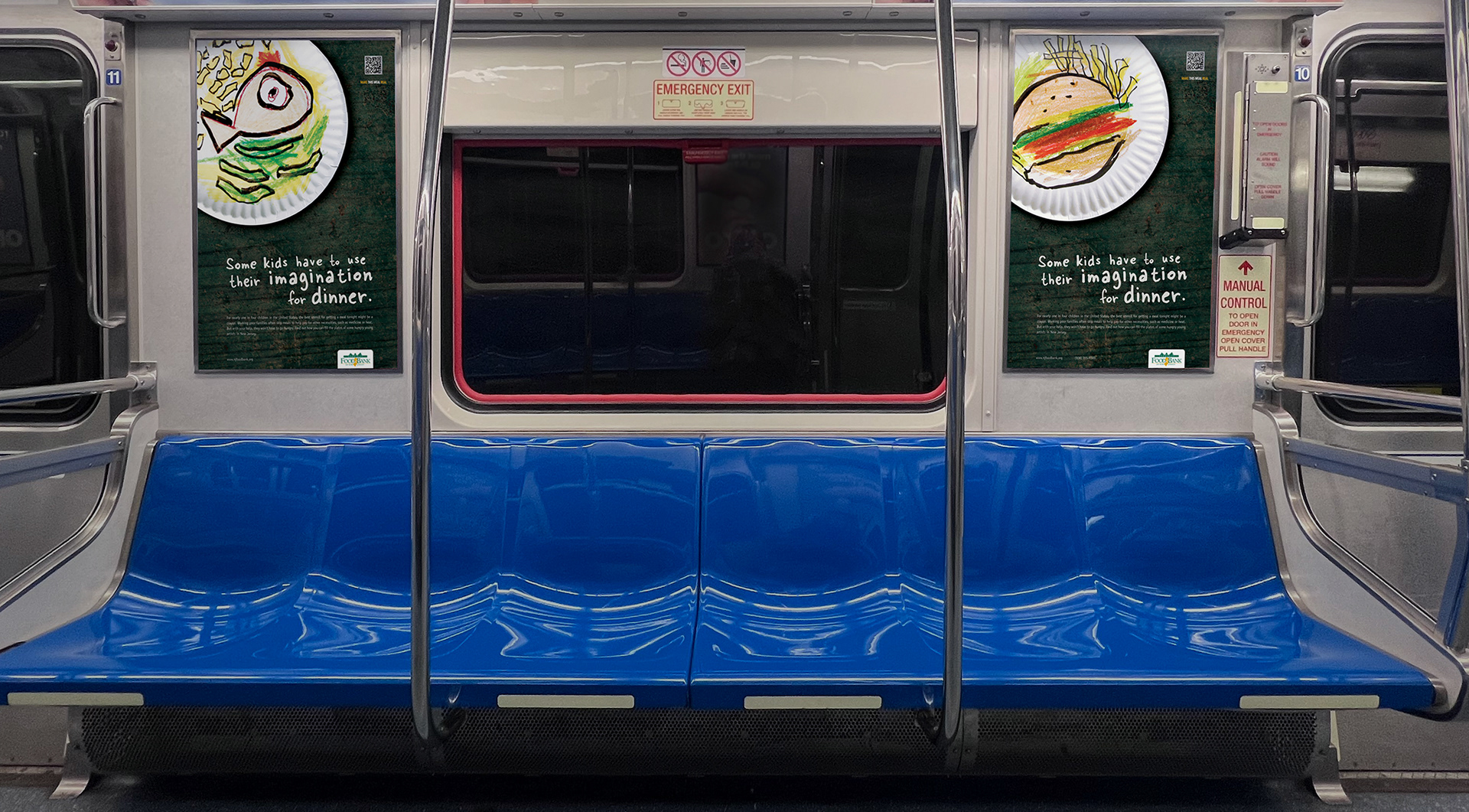 Launched in 2011 for the Community FoodBank of New Jersey, Imaginary Dinner distilled hunger into one arresting image: children’s crayon drawings of the meals they wished for — vivid food on empty plates. Amplified by Jon Bon Jovi and scaled across billboards, transit, truck fleets, and community events statewide, the campaign ran for over a decade — turning awareness into action, helping provide 90+ million meals, and earning a Clio Award.