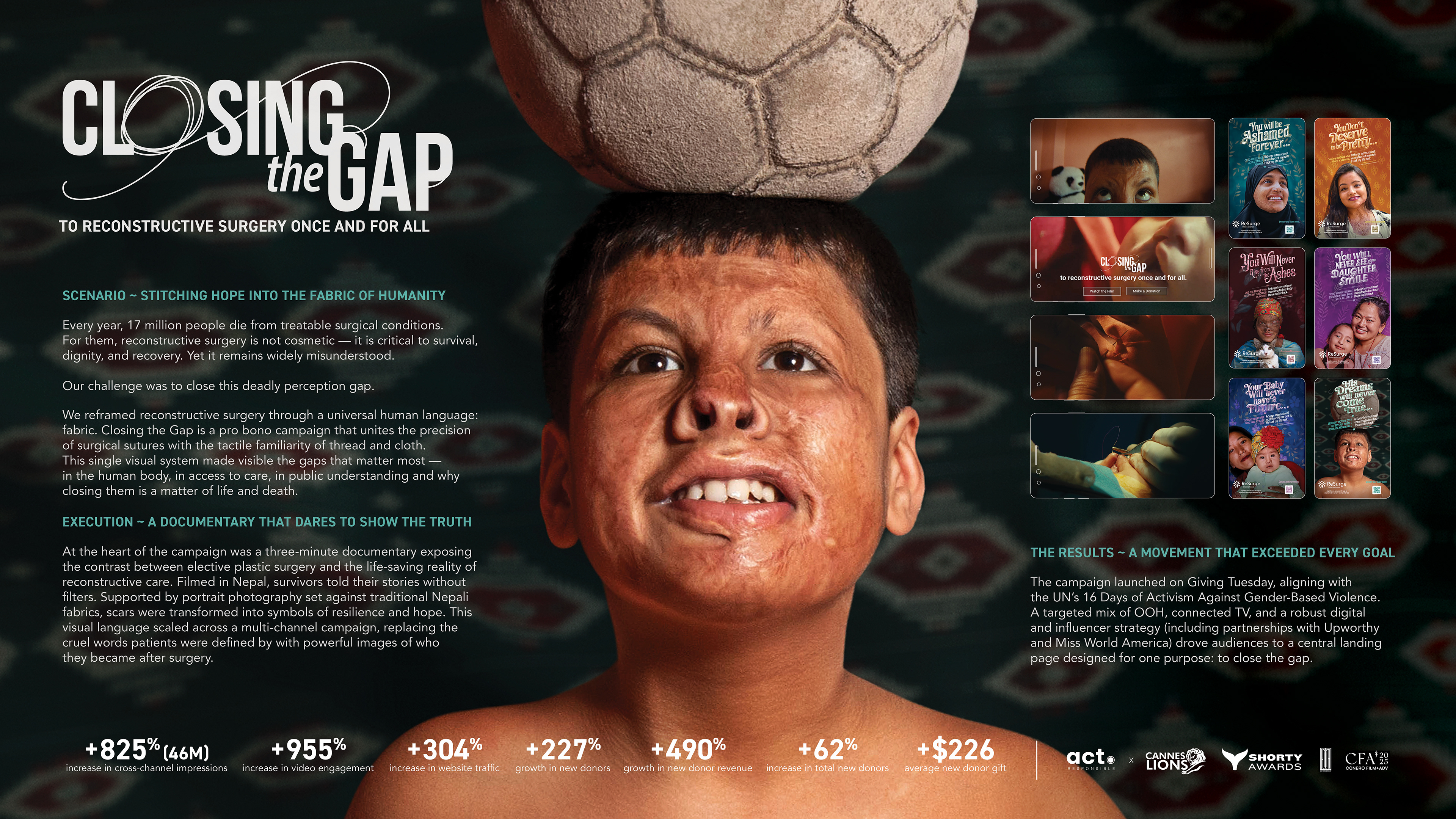 Closing the Gap is a global awareness campaign created in collaboration with the nonprofit ReSurge International, confronting a dangerous misconception: while the world debates beauty, millions wait for plastic surgery that determines whether they live with dignity — or at all. Using fabric and sutures as a universal visual language, the campaign makes physical and emotional wounds impossible to ignore, transforming scars into proof of survival and challenging what “plastic surgery” truly means. The documentary-led campaign has earned multiple international awards (ACT at Cannes, Shorty Impact, KTR, CFA) amplifying its call to recognize reconstructive surgery as essential, life-saving care.